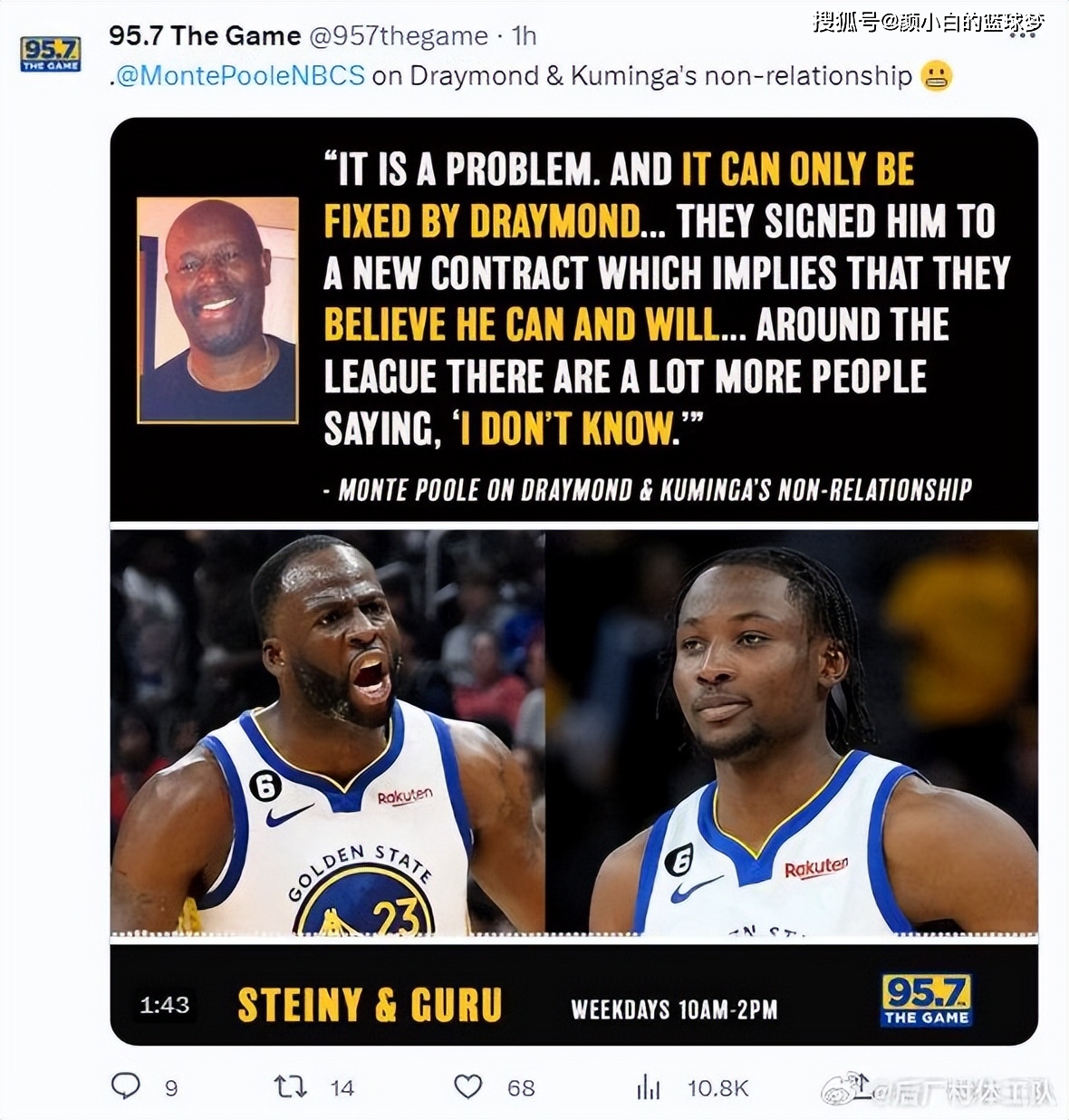 此前勇士记者Monte Poole爆料,追梦与库明加的关系并不好,这只能由追梦去改善,勇士给他一份四年1亿的长约说明追梦会试图改善与年轻球员的关系。