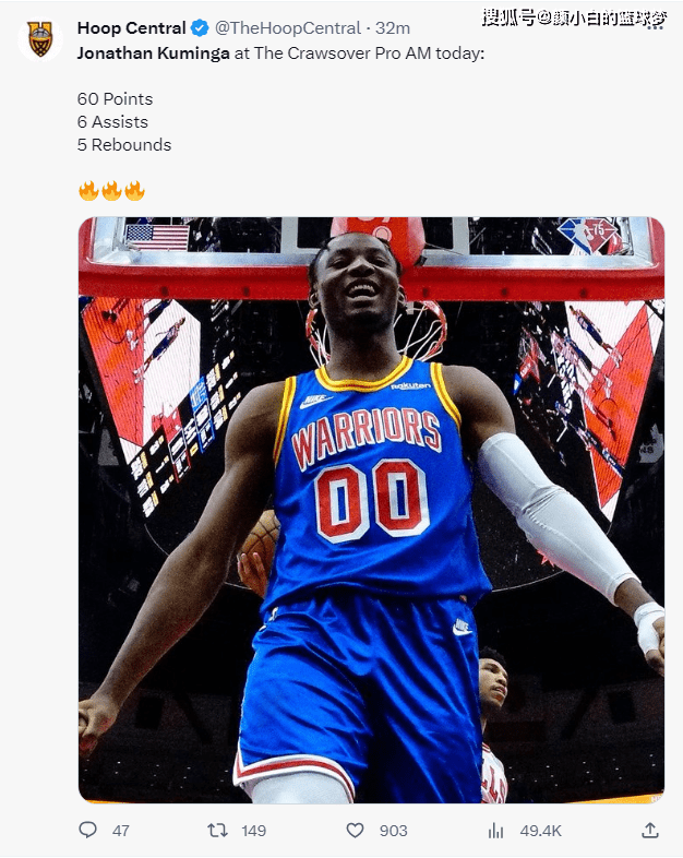 北京时间8月13日,勇士球员乔纳森-库明加参与了克劳福德建立的业余联赛,在这场比赛中库明加狂砍60分6助攻5篮板的炸裂数据打爆对手。