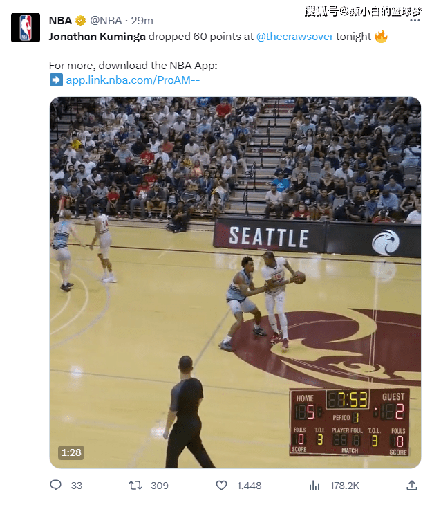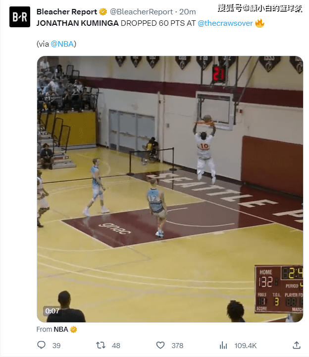 NBA官方都转发库明加这场比赛的精彩集锦为其点赞,库明加从开场就统治了比赛,NBA球员来真是降维打击。