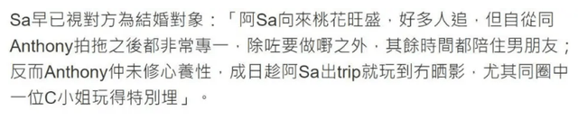 双方为何分手,也成为吃瓜群众好奇的焦点,港媒爆料男方虽然与阿Sa恋爱多年,但是对家庭的向往远不如阿Sa强烈,二人在婚姻问题上有了很大的不同看法。
