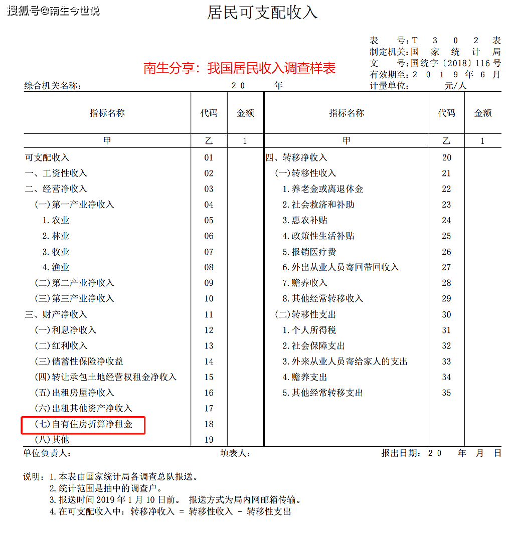 下图是我国居民人均可支配收入调查样表截图,在“财产性收入”模块中,第七个组成部分就是自有住房的虚拟租金折算。顺便提一下,医疗报销也属于收入,同时也属于支出部分。