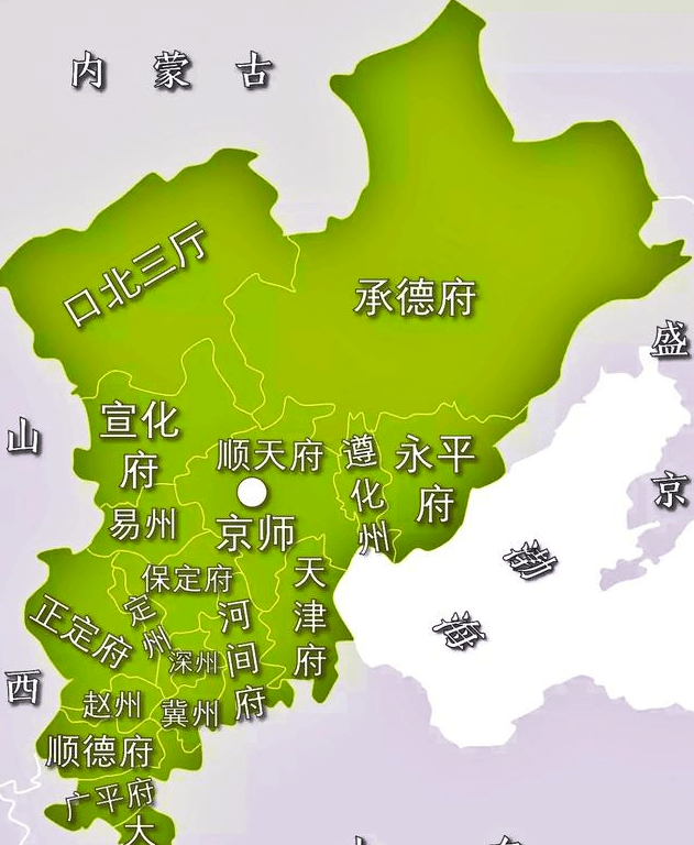 以直隶省为例,直隶省的承德府,管理了1个散州、5个县,分别是:平泉州、滦平县、丰宁县、建昌县、朝阳县、赤峰县。除此之外,内蒙古东部两个盟的17个旗,也隶属于承德府管理,分别是:土默特左旗、土默特右旗、喀喇沁左旗、喀喇沁右旗、喀喇沁中旗、敖汉旗、翁牛特左旗、翁牛特右旗、奈曼旗、巴林左旗、巴林右旗、扎鲁特左旗、扎鲁特右旗、阿鲁科尔沁旗、克什克腾旗、喀尔喀左翼旗、西勒图库伦喇嘛一旗。