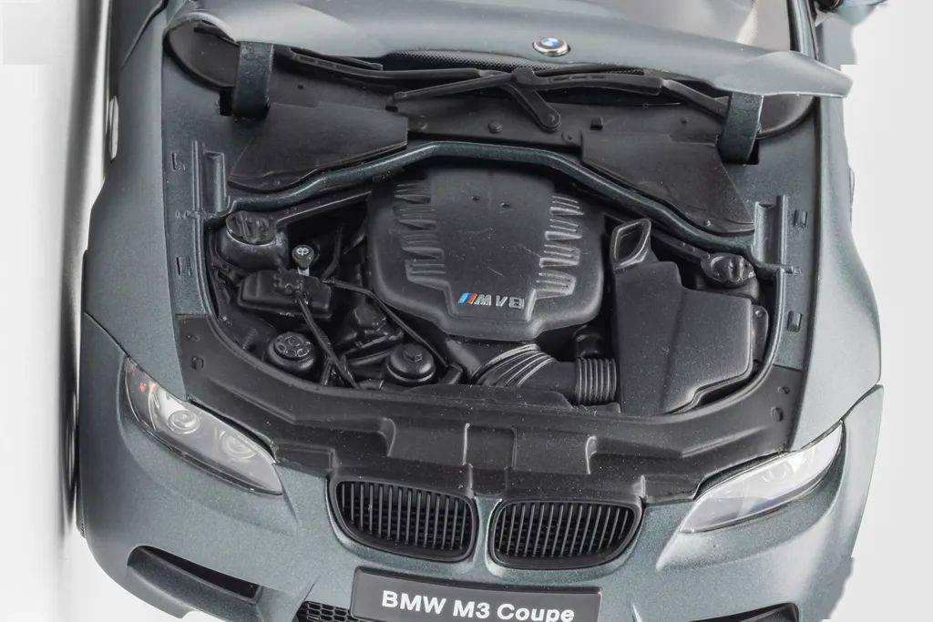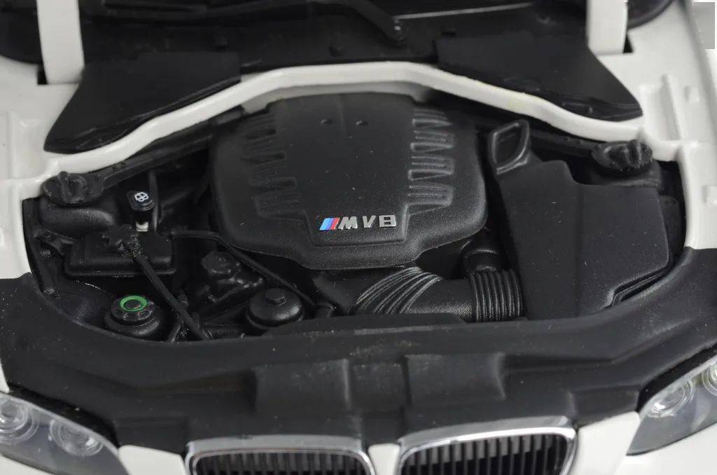 复刻版的发动机盖采用了大狗腿结构,前盖内侧有些浮雕细节;发动机是浮雕的澡盆结构,独立件和分色细节都比较一般,管路细节也比较少,整体上讲京商的这款M3 E92发动机比较普通,不是其重点。