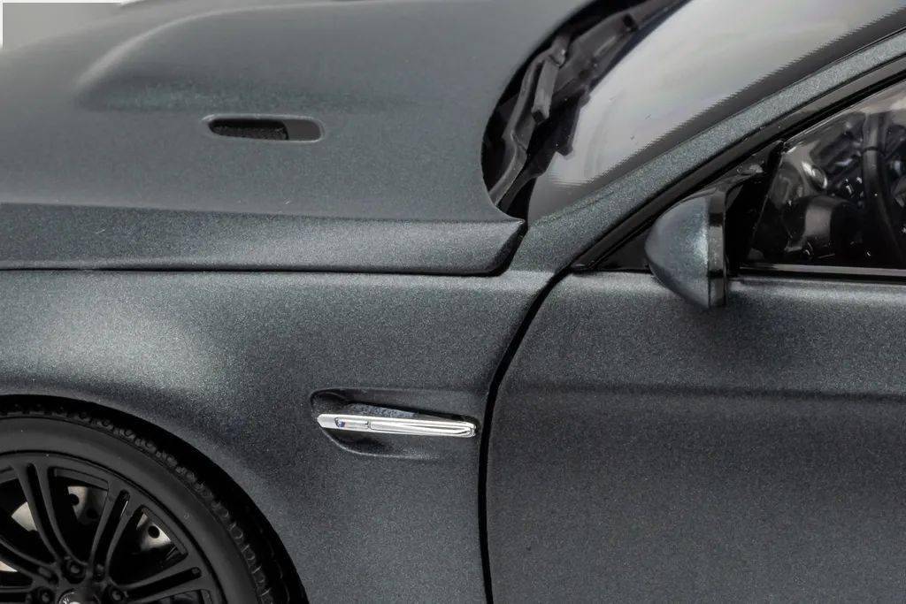 首先在形准上,复刻M3和早期原版都是没啥问题的,作为当年京商的颜值担当,这款M3 E92无论是形准、漆面、缝隙等各个方面都值得肯定,而到了多次复刻后的这款产品,漆面有色差,缝隙大不少,整个模型的底盘都升高了不少;复刻版的轮毂为亮黑色,比起原版的哑光银质感和细腻程度上都差了不少,不过刹车系统也是采用蚀刻片,刹车钳也做了出来,起码在配置上复刻和原版是一样标准的。