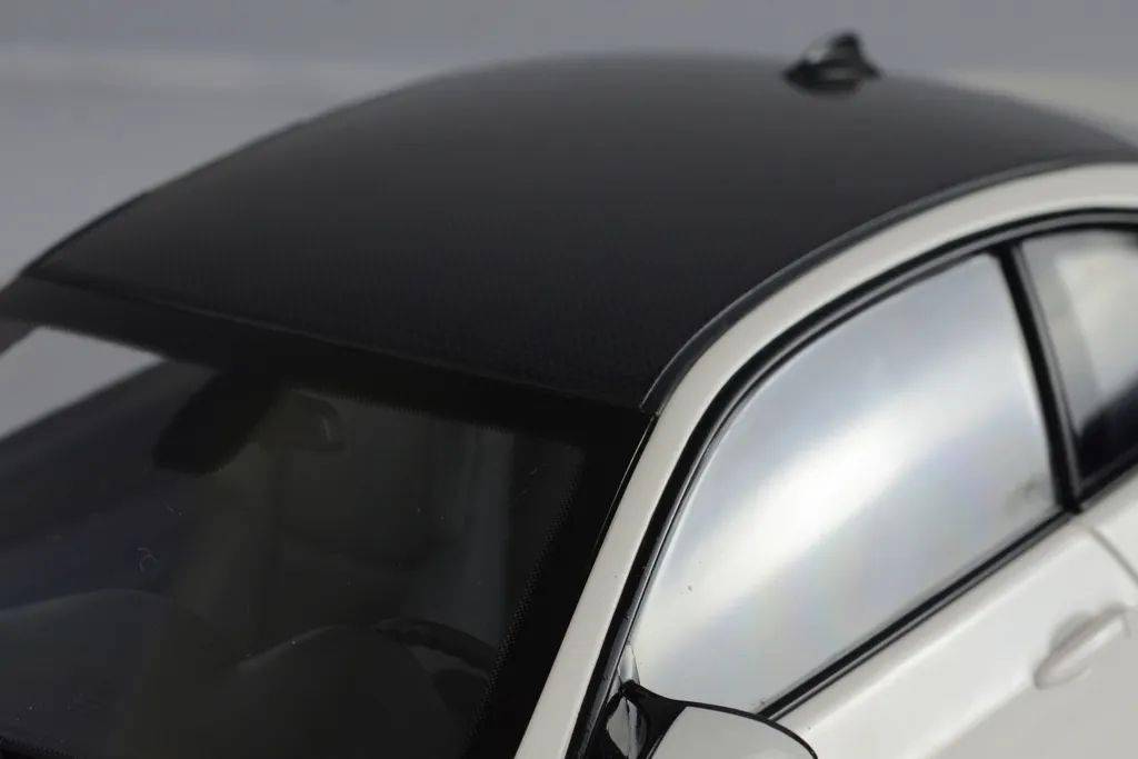 复刻版除了轻微色差外,漆面整体质感还算过得去,但和原版比起来,差距就上来了,而缝隙的水平更是差得离谱;车顶的碳纤维样式也是完全不同的,原版的更为逼真;模型的雨刮器为独立塑料零件,细节还行,后挡风玻璃有高位刹车灯细节,还算还原到位。