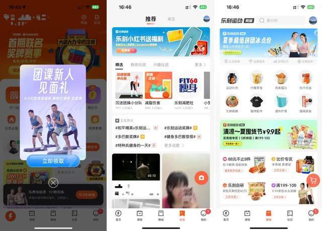 乐刻APP的首页、商城和社区 图源:乐刻APP