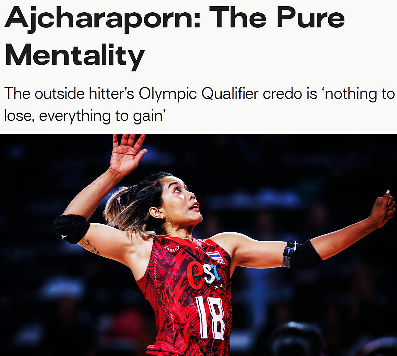 国际排联官网报道,泰国女排主攻阿耶查拉蓬表示,如果不能打入奥运会,也不意味着运动员生涯的失败。阿耶查拉蓬表示,奥预赛的对手都很强,想要突出重围真的很难。