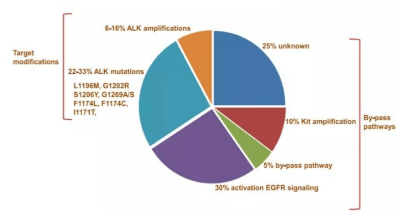 以突变概率切入分析,约70%的ALK靶点耐药突变属于ALK非依赖型,仅30%的耐药突变属于ALK依赖型。鉴于ALK耐药突变存在诸多类型,因此患者在一线药物出现耐药后务必进行基因检测,找准耐药突变原因后的对症下药才能获得好的效果。