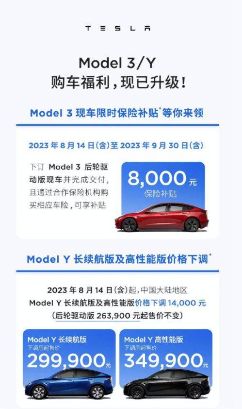 8月14日,特斯拉官宣降价。Model Y长续航版和高性能版都降价1.4万元,长续航版的起售价已经来到了29.99万元。至于Model 3,官方只是提供了8000元的限时保险补贴。