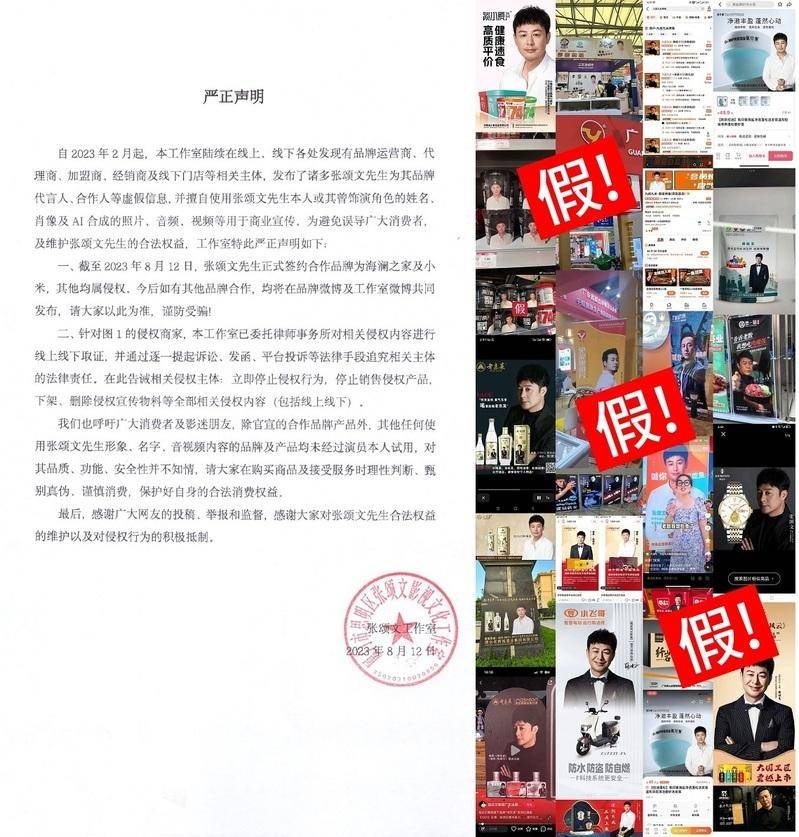 8月12日下午6时许,演员张颂文的工作室“张颂文表演工作室”在微博公开打假,晒出多张使用张颂文肖像商品的照片和一纸“严正声明”,表示张颂文正式签约的合作品牌仅海澜之家和小米,其他擅自使用其肖像的商品均属侵权行为。