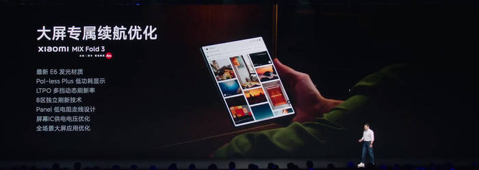 另外,小米MIX Fold 3的屏幕有着康宁Victus 2保护玻璃,专业原色屏,支持跨屏同色,并与iPhone的色准保持一致。值得一提的是屏幕采用Pol-less PluS显示,在屏幕上去掉了偏光片,跟市面的折叠屏相比功耗低了52%。两块屏幕也都支持120Hz高刷、HDR 10+、杜比视界、前后360°色温光线传感器等,让用户的使用体验保持一致,不会造成割裂感。