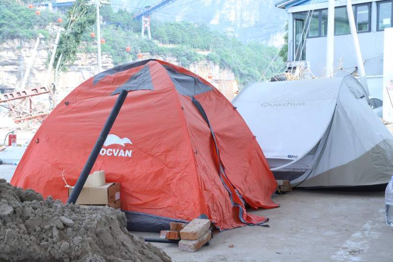 8月10日,十渡加油站三名女员工睡在简易帐篷内。新京报记者 陈璐 摄