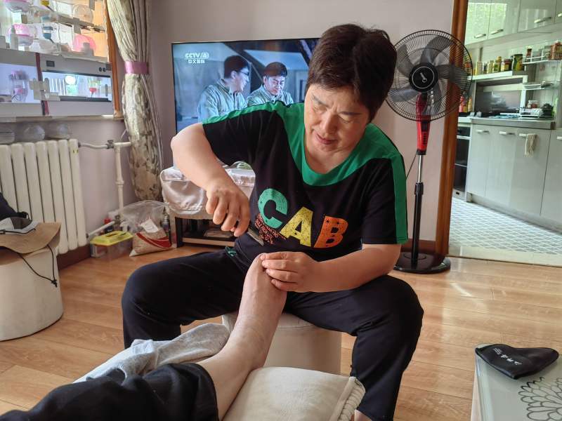 护理员陈素芳正在失能老人家里给老人修脚。新京报记者 刘思维 摄