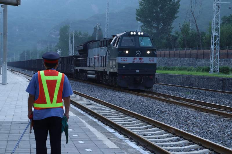 8月11日,十渡站工作人员指引火车进站。新京报记者 陈璐 摄