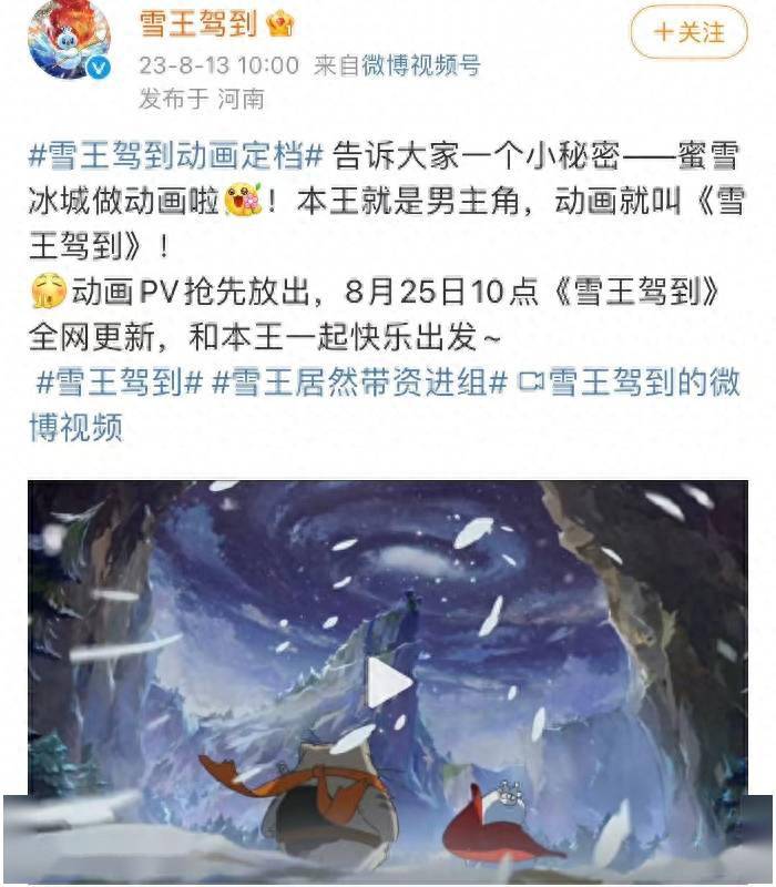 8月13日,茶饮品牌蜜雪冰城在官方微博宣布,以旗下 IP“雪王”为男主角的首部动画《雪王驾到》,将于8月25日上午10点全网开播。