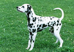 大麦町犬(Dalmatian,也叫斑点狗),原产于南斯拉夫,不过根据古希腊和古埃及的一些历史遗迹,有人认为该犬的起源应该是埃及和印度。斑点狗平静而警惕、强健、肌肉发达、轮廓匀称、毫不羞怯,表现聪明伶俐,听话易训,感觉敏锐,容易与小孩相处。