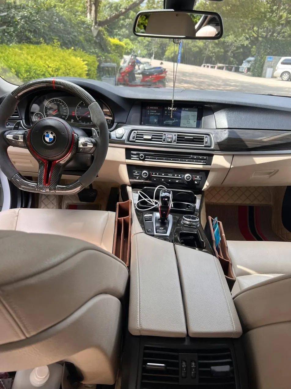这辆5系贴了一个改色膜,更换了碳纤维的方向盘,换过主机,从NBT换成了EVO,避震升级到了KW V3,轮毂从18英寸加大到了19英寸,前后配的轮胎。