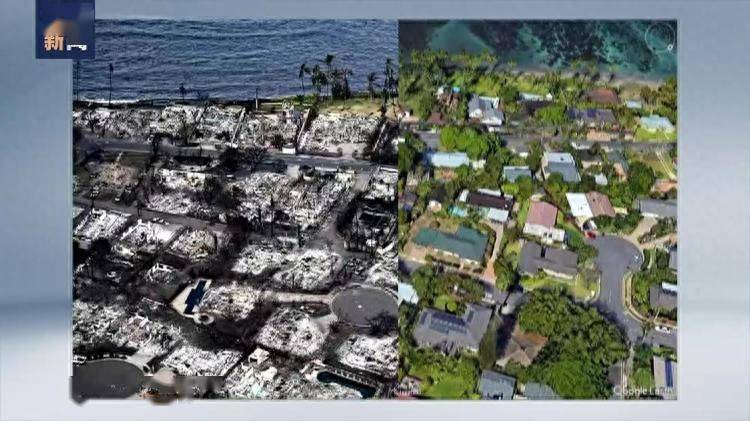 一组对比照片显示,海滨度假小镇——拉海纳在火灾中遭受灾难性打击,到处可见断壁残垣。