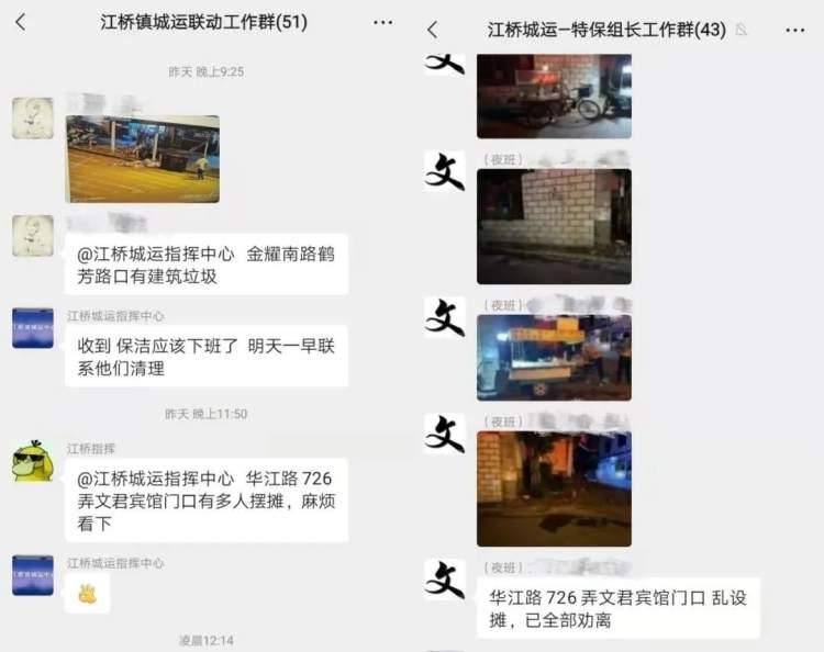 7月10日23:50,江桥派出所指挥中心发现华江路726弄某宾馆门口多人无证摆摊,立即联动镇城运中心处置,城运中心通过视频巡查发现设摊现象依旧存在并且数量众多,立马派晚班特保队员前往处置,11日凌晨0:14城运队员处置完毕并将结果反馈给江桥派出所,继续驻守确保不“返潮”。