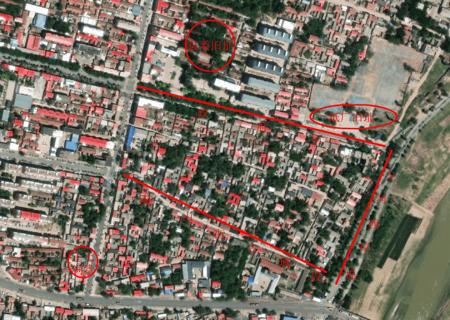 卫星图上的馆陶老街区域,及纸厂、县委等旧址