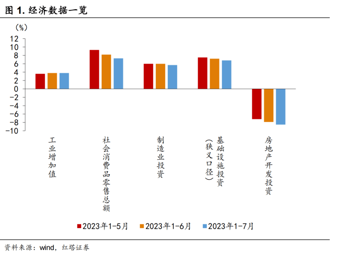 7月经济数据再度遇冷,多个分项低于市场预期。社会消费品零售总额同比增长2.5%,市场预期5.3%;规模以上工业增加值同比增长3.7%,市场预期4.6%;1-7月固定资产投资同比增长3.4%,市场预期3.9%。