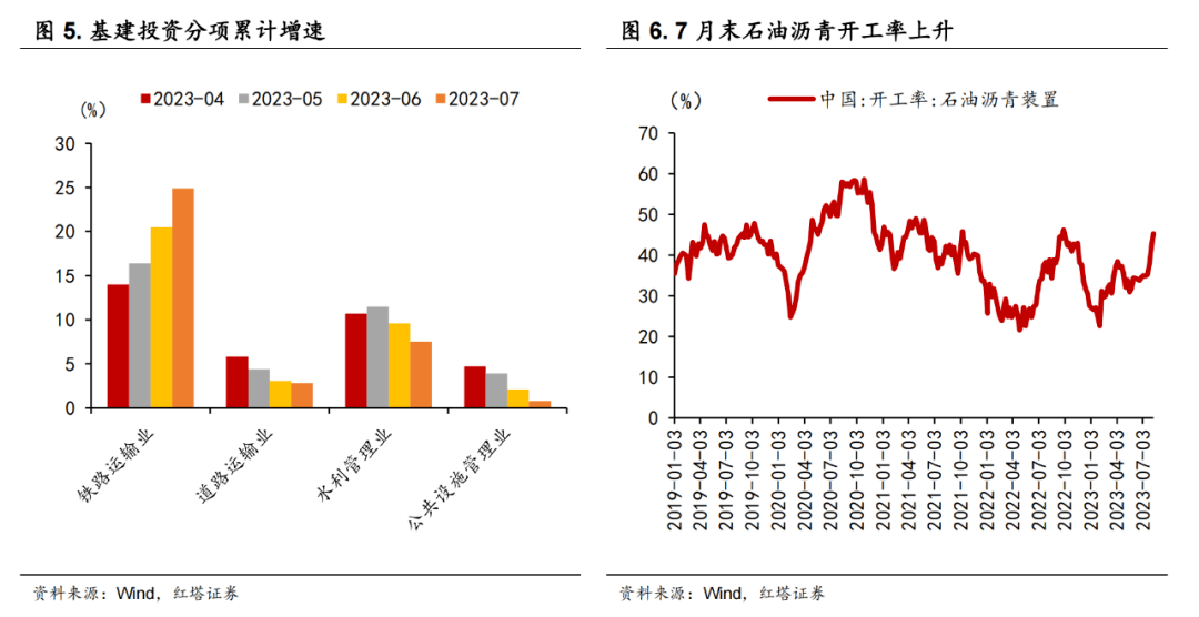 往后来看,监管要求地方新增专项债在9月前发行完毕,10月前使用完毕,预计基建投资会有所增强。从高频数据来看,7月末石油沥青装置开工率快速回升,指向基建尤其是传统基建开始集中发力。