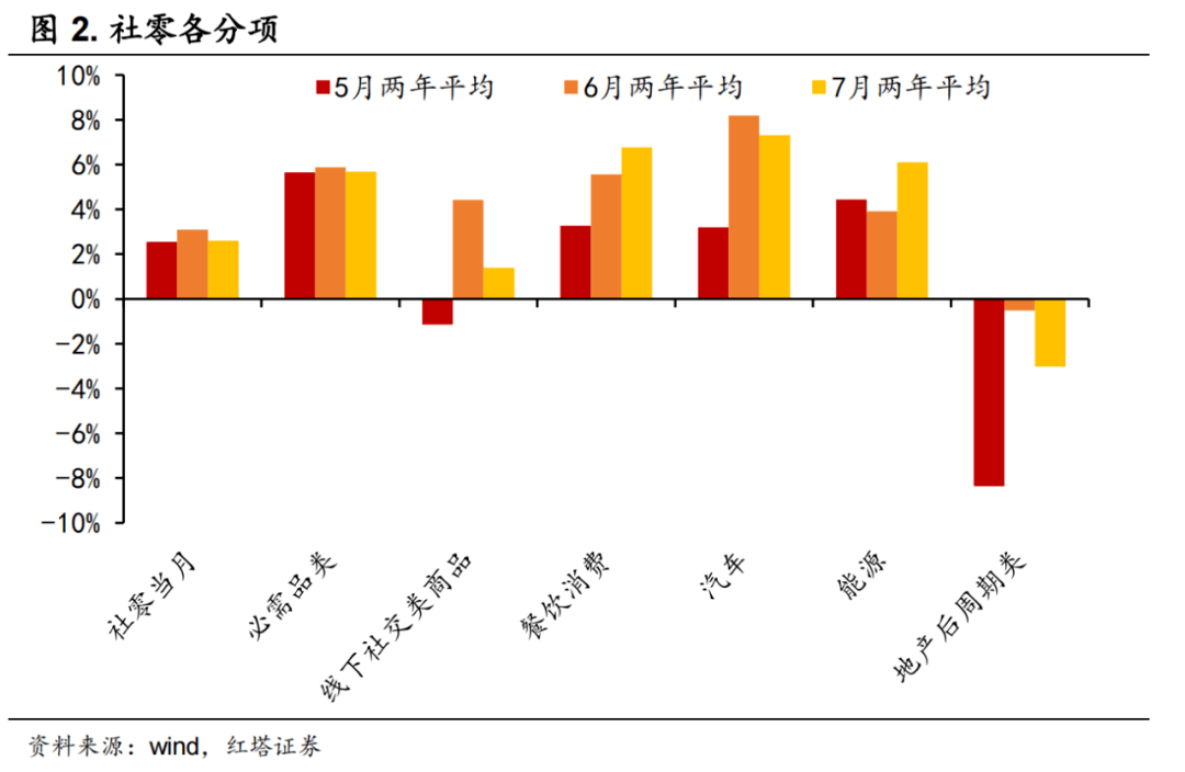 耐用品方面,家用电器和音响器材类和建筑及装潢材料类零售额的两年平均增速为-1.0%和-12%,降幅分别较前值扩大2.4和3.2个百分点,在高温催生的空调等家电购置需求减少后,地产销售的持续低迷对地产后周期消费的拖累影响显现。