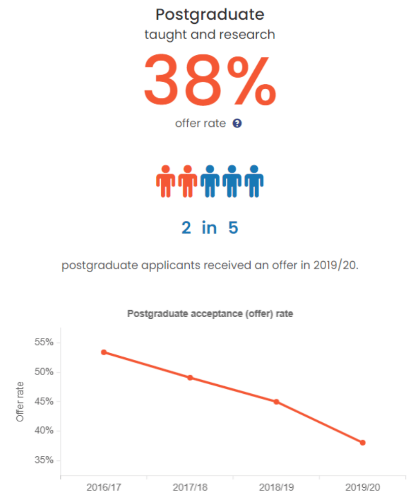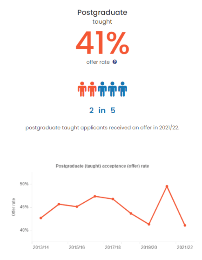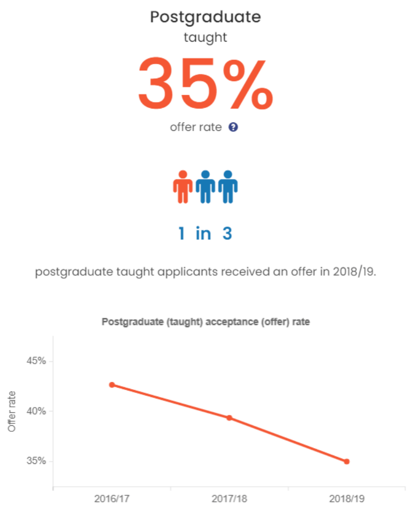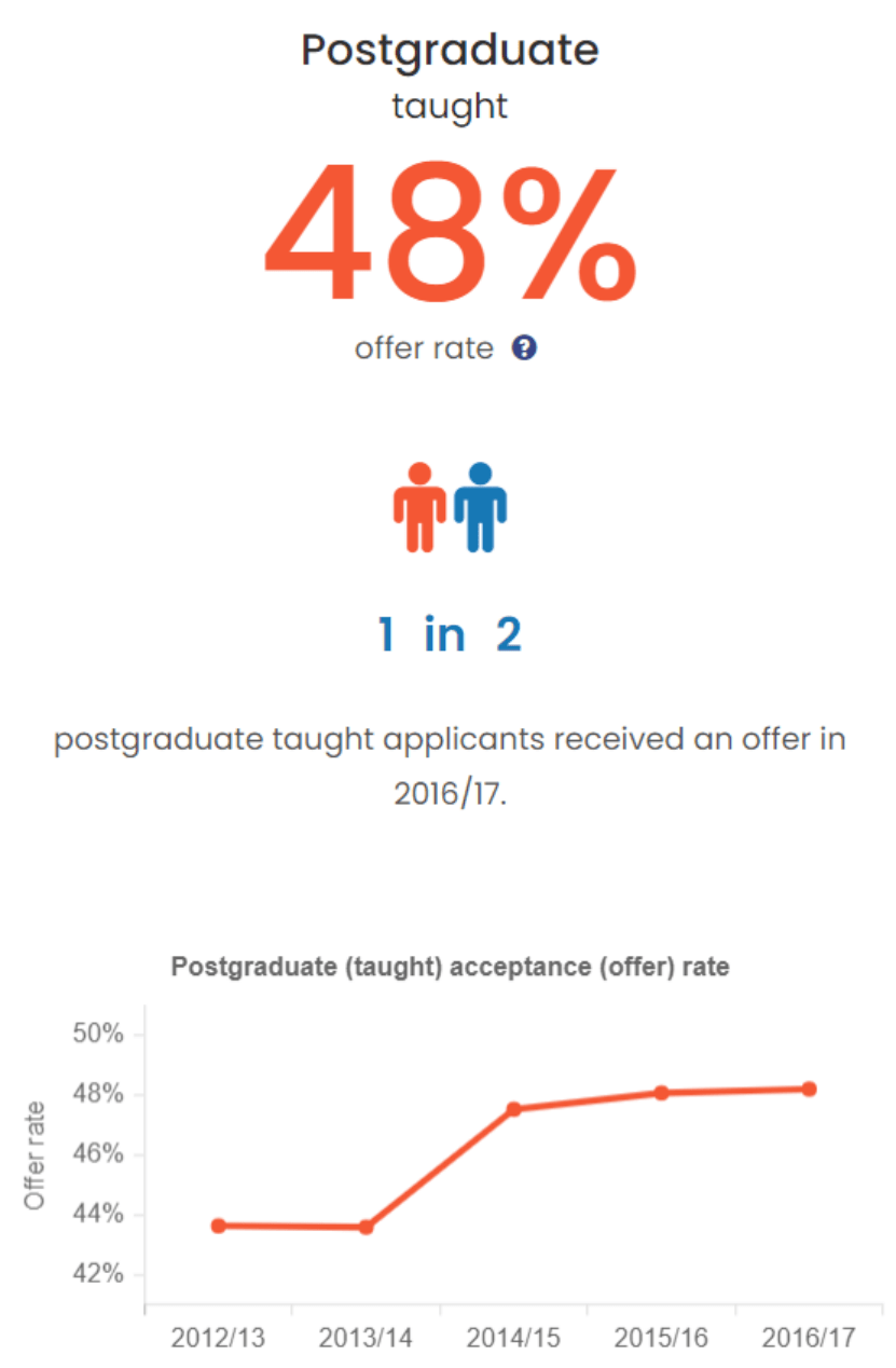 学校暂未公布新的录取数据,根据可查到的2016/17年度数据,其授课型硕士录取率是48%,但根据近年来的申请热度来看,录取率普遍呈下降趋势,实际录取率远低于这个数字。