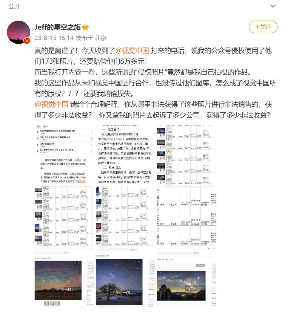 此前,微博用户“Jeff的星空之旅”、摄影师戴建峰发文称,视觉中国因为戴建峰的公众号使用了自己拍摄的173张照片,认为其侵权,遂向自己索赔8万多元。视觉中国官方微博发文回应称,“涉事图片的销售授权链条清晰完整”,会妥善处理相关“误解”。