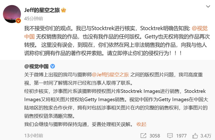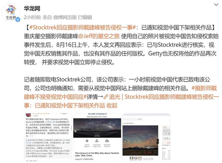 不过事件并没有因为“误会”而结束,在8月15日晚视觉中国在微博上表示,“经初步核实,涉事图片系该摄影师授权图片库Stocktrek Images进行销售,Stocktrek Images又将相关图片授权给Getty Images销售。视觉中国作为Getty Images在中国大陆地区的独家合作伙伴,拥有对包括涉事相关图片在内的完整的销售权利,涉事图片的销售授权链条清晰完整。”省流版:我有戴建峰照片版权,我能卖。对此,戴建峰迅速与Stocktrek进行核实,确定视觉中国无权销售其任何作品,也没有版权,要求其停止侵权行为。