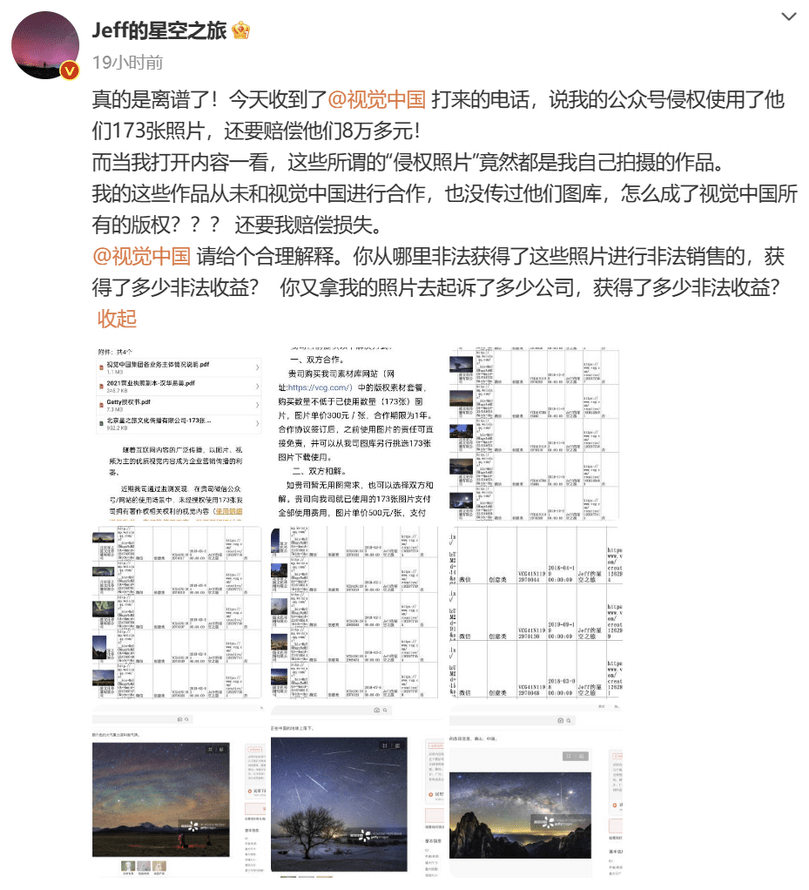视觉中国再起争端了,它表示戴建峰(ID:Jeff的星空之旅)公众号侵权使用了视觉中国173张,索赔八万多元。“很不巧”的是,索赔的照片正是戴建峰本人拍摄,加上视觉中国已是一名惯犯——在2019年曾因黑洞照片事件被处罚了30万元,因此事件迅速冲上头条,更是引发摄影师担忧——该如何保护自己的权益。