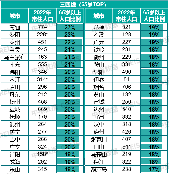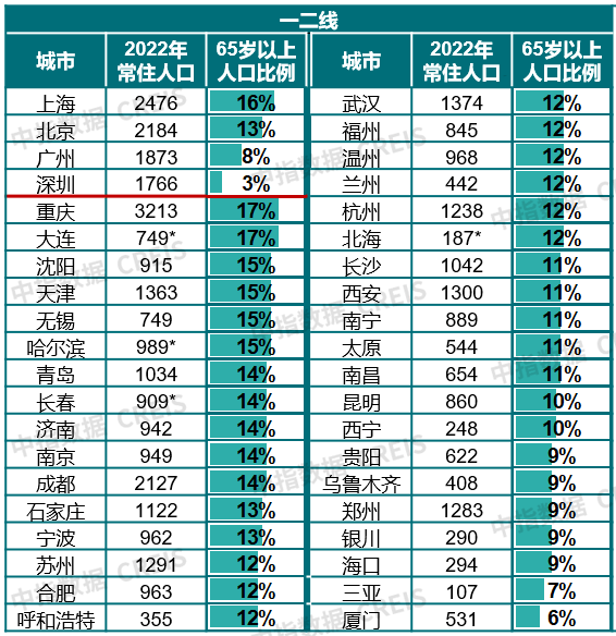 表:一二线城市及重点三四线城市常住人口及老龄化情况