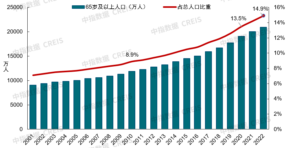 老龄化加剧:2022年末,我国60岁及以上人口达2.8亿,占全国总人口的19.8%;65岁及以上人口为2.1亿,占全国总人口14.9%。