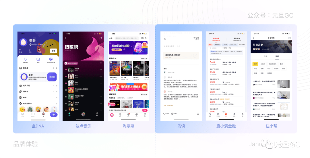 比如在产品和产品之间也存在很大的差异,比如在有些年轻社交娱乐的app中,色彩往往比较大胆,配色强烈吸引,面积占比较大,如淘票票、盒DNA、波点音乐;在有些比如金融、阅读、等偏文本内容相关的app中在主要界面大多配色和颜色种类会比较冷淡和克制,为了保证用户对于信息的专注,相信你也能在这两组图片中明显感受到不同调性。