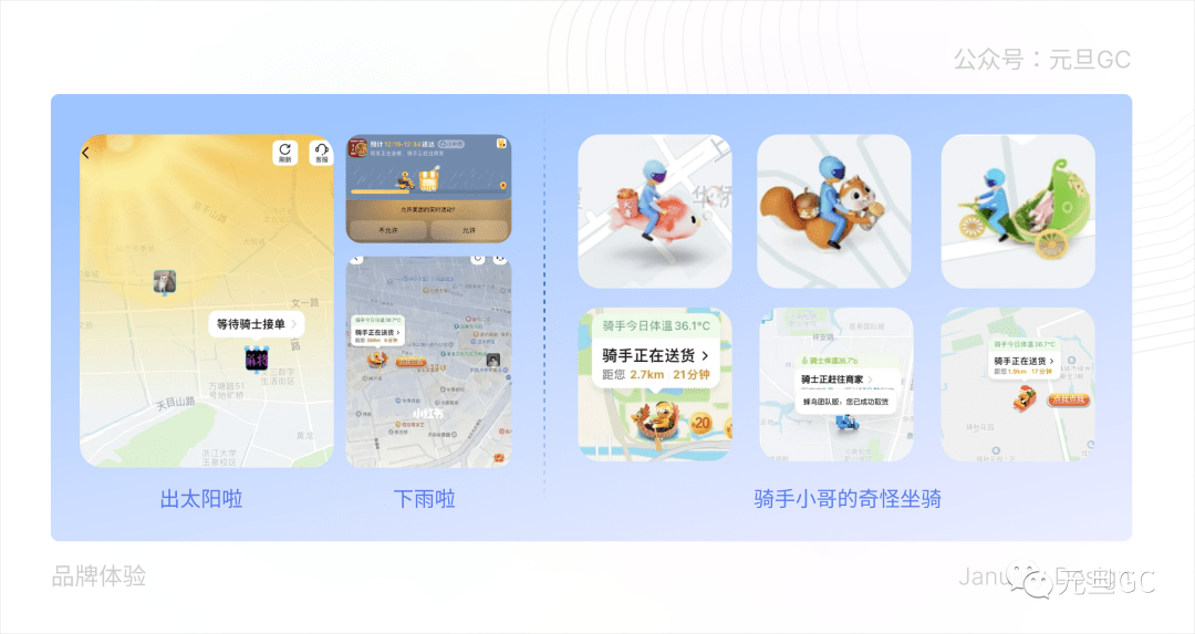 在外卖软件中,当有恶劣天气时也会配合相应的视觉和效果下雨、下雪等配合文案,将状况传达给用户,目的就是缓解用户等待的情绪,或者会进行一些创意设计来娱乐用户。