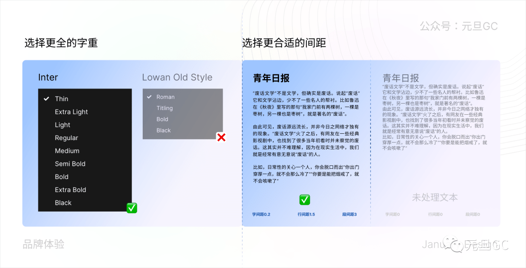 选择字重更全的字体,通常在一页信息中,不建议使用超过3种字体,字重全即使只使用一种字体也能设计丰富的层次。