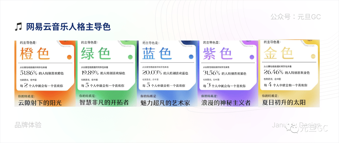不知道大家记不记得在21年浏览量超高的网易云人格主导色的H5营销,通过听一段声音、回答几个问题、输入自己名字,在心理上让你感觉结果和你高度匹配,将不同的人赋予了不同的色彩属性;除了用户确实喜欢外,色彩的喜爱偏好确实代表部分人的性格,喜欢蓝色灰色的大都会抑郁一些,喜欢红色黄色的热情的居多。