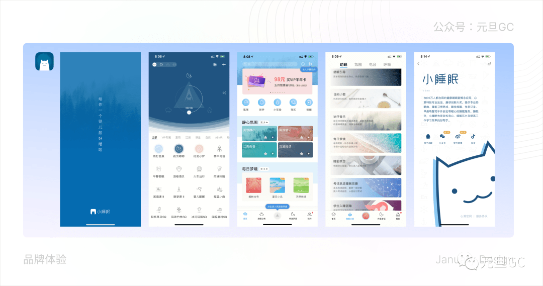 我很喜欢一款安静惬意的app:小睡眠,相信很多人也听过,它的品牌色为蓝色,其他辅助色也基本都会偏向于冷色调的一个区间,比如紫、暗黄、灰、暗沉等等作为一个使用场景基本在夜晚的助眠软件,就是为了帮助缓解身心,快速入眠,也起到了安抚用户情绪的作用。