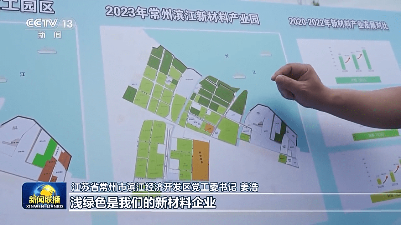 江苏省常州市滨江经济开发区党工委书记 姜浩:深绿色的就是复绿的生态空间,浅绿色是新材料的企业,占地面积已经明显增大了。工业产值不降反升,两年跨了两个百亿的台阶。