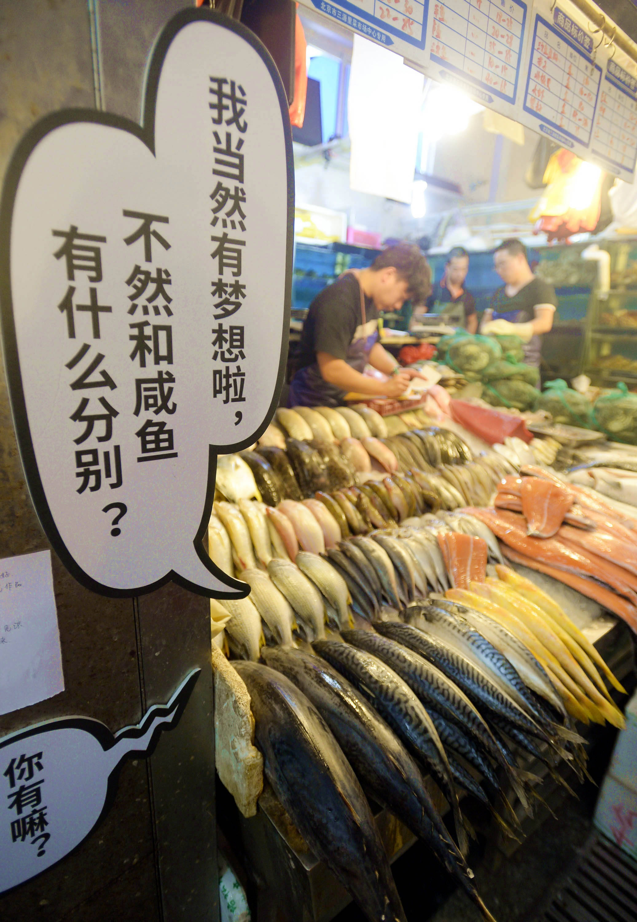北京三源里菜市场里的水产商户在展示自家的生活艺术 新华社记者 李欣摄