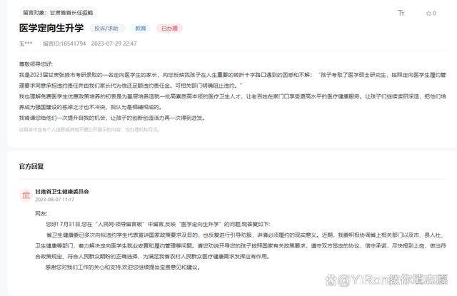 比如在2023年7月底的人民网领导留言板上,就有甘肃省的医学定向生家长求助,该家长的孩子当年被录取为定向医学生,今年毕业应该进行定向就业了,可是该学生考研被录取,家长想让孩子继续读研深造,不想进行定向就业,而且家长也知道毁约需要承担相应的违约责任并支付违约金,在家长愿意支付违约金的情况下,却得到了吸收定向生的相关部门明确的劝导,要求学生必须履约。