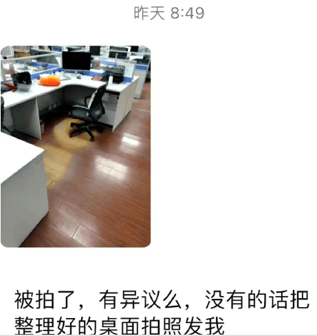 负责管理的人员还直接在群里发了一张照片,并@他,“被拍了,有异议么,没有的话把整理好的桌面拍照发给我。”