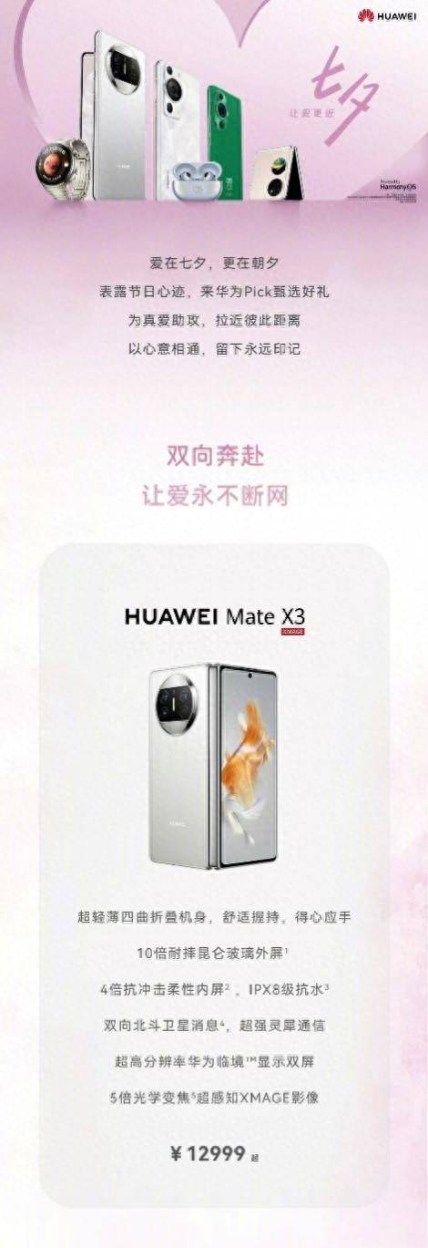 再过几天情侣们又将迎来甜蜜气息满满的节日——七夕节。现在的年轻人越来越注重仪式感,七夕节期间,男女之间自然也少不了互赠礼品。事实上,除了女生喜欢的首饰、化妆品,男生喜欢的球鞋、手表以外,造型更独特且功能丰富的折叠屏手机也是不错的选择。就像今年很火的华为Mate X3折叠屏手机,从内到外都能带给你难以忘怀的七夕仪式感。