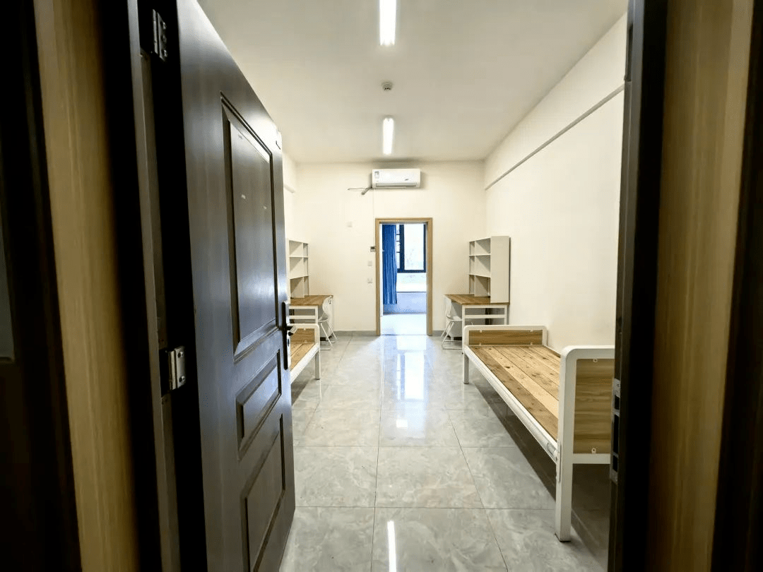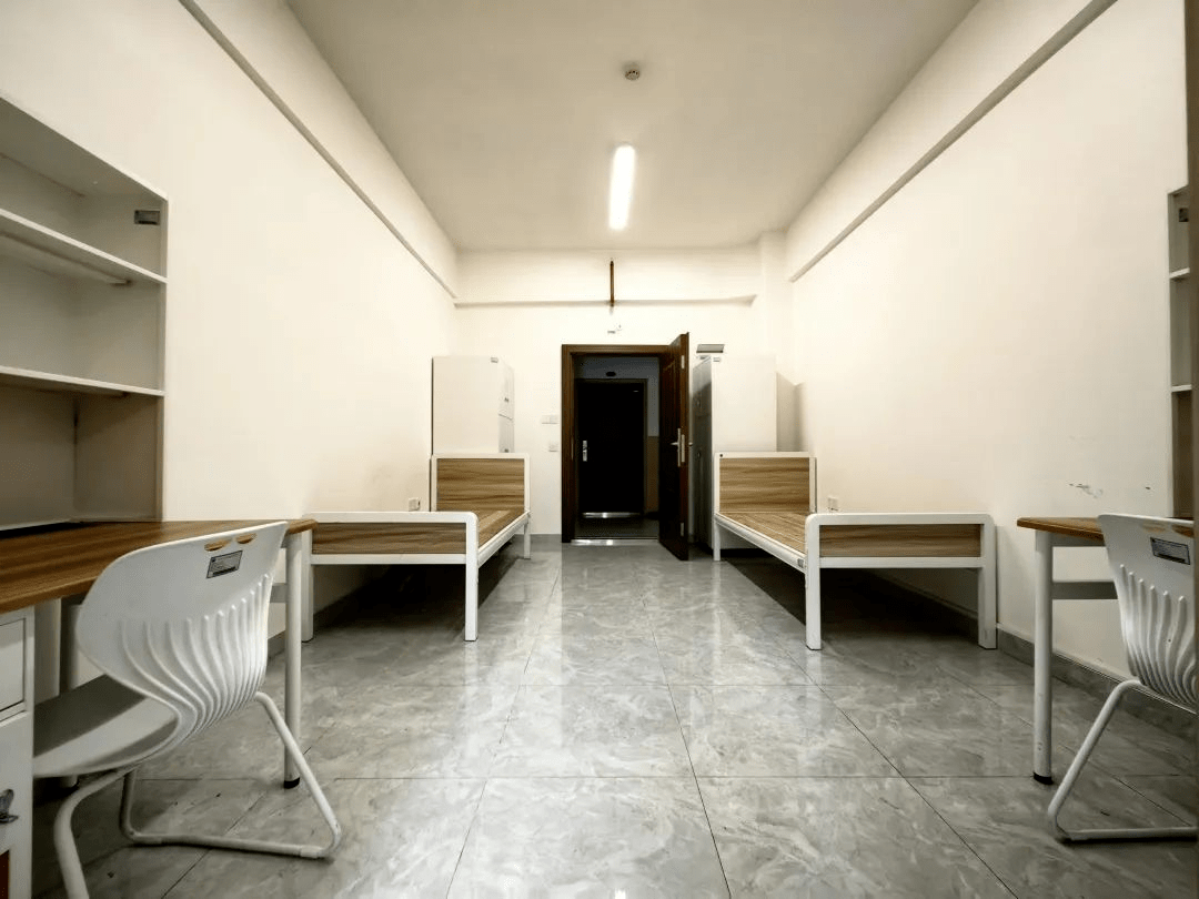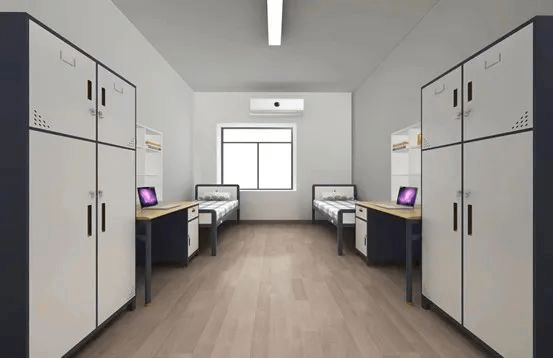 武汉大学公布的夫妻宿舍内景图显示,宿舍里配有两张单人床、两张桌子和两个衣柜。