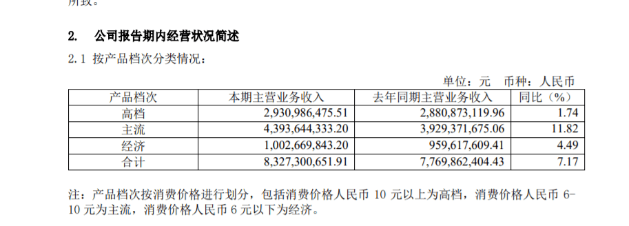 今年半年报显示,按产品档次划分,重庆啤酒高档啤酒(10元以上)上半年营业收入29亿元,同比增长1.74%;主流啤酒44亿元,同比增长11.82%,主流啤酒(6-10元价位)表现最好。