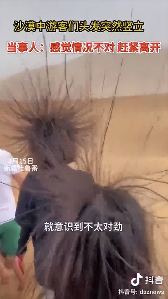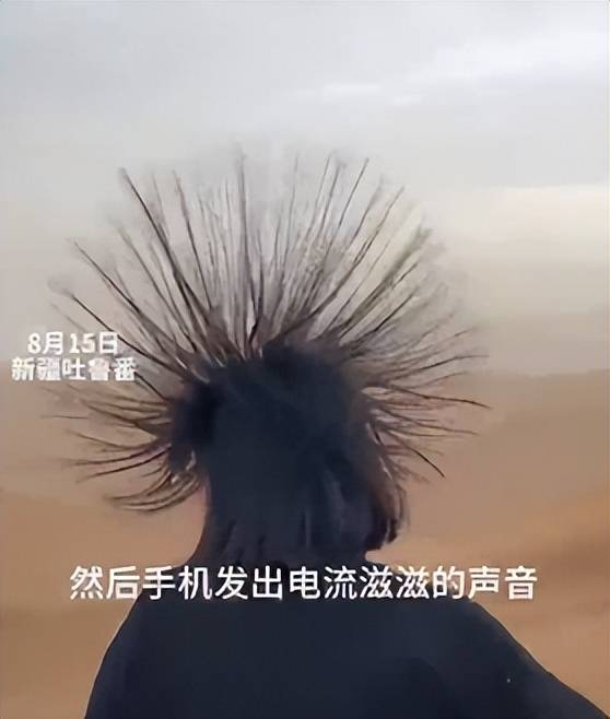 8月15日10时左右,新疆维吾尔自治区吐鲁番市某沙漠景区游客正在游玩,突然有几位女士头发直立竖向空中,在驾车驶离2至3公里后恢复正常。