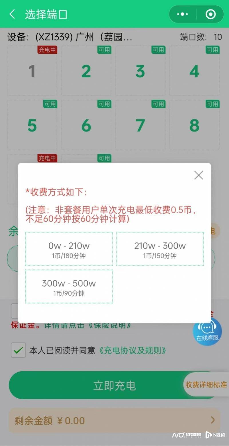 8月15日下午,记者来到番禺区荔园地产中心附近的充电设施,其充电桩品牌为“小猪胖胖”。这里一共有10个充电桩,每个充电桩一个插座。记者扫码后发现,充电费用按照时间/功率进行收费,0w-210w为1币/180分钟;210w-300w为1币/150分钟;300w-500w为1币/90分钟,这里的1币为1元。此外,品牌还推出包月服务,支付30元可以开通月卡,但限制在荔园地产中心区域内使用,每天限8小时/台。记者发现,计费时并不区分充电电费与充电服务费,而是打包混收。