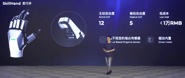 远征 A1 还具备灵巧手,手部有 12 个主动自由度,指尖有基于视觉的指尖传感器,可以分辨所执行任务的颜色、材质等。