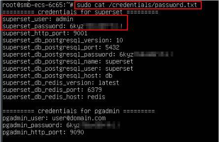 1.登录云服务器,运行如下命令获取Superset管理界面的管理员用户名及密码。