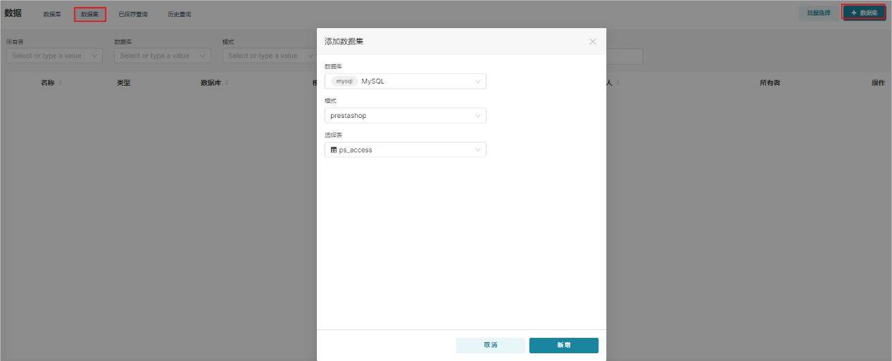 有了数据源后,我们需要创建一个数据集来支持后续的图表创建。